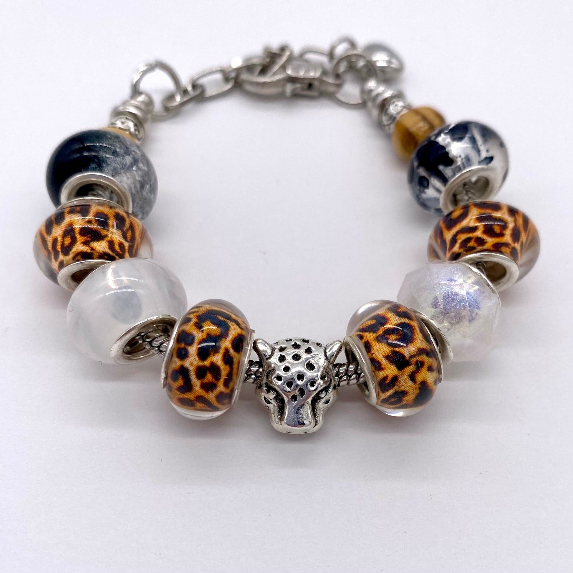 This stylish beaded bracelet is a statement accessory that combines a mix of textures and materials for a bold and modern look. The bracelet features eye-catching acrylic beads with a distinctive animal print design, complemented by smooth wooden beads, shiny metallic details, and subtle plastic elements. At the center of each bracelet sits a striking leopard head bead, adding a unique and elegant touch to the overall design.