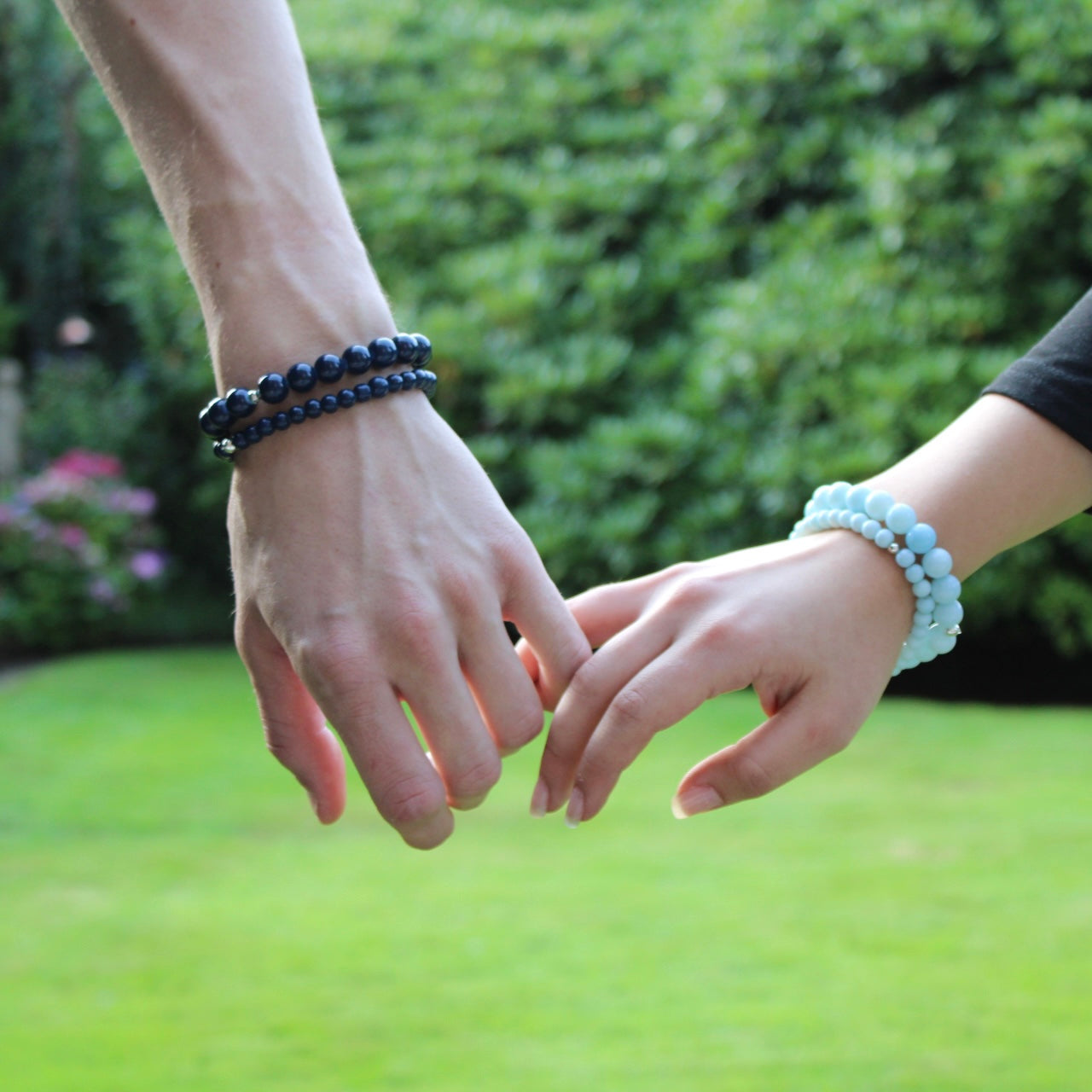 Measuring approximately 22 cm in length, the elastic design allows them to adjust naturally to most wrist sizes. The set includes one bracelet in deep navy tones and another in light sky blue, making them a beautiful pairing for couples, friends, or simply as a stylish stack for one wrist.