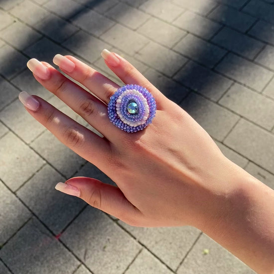 Shimmering in soft shades of violet, blue, and white, this handmade ring is crafted from seed beads, fabric, and Swarovski crystal accents. The intricate beadwork creates a dimensional layered design that sparkles beautifully in the light.