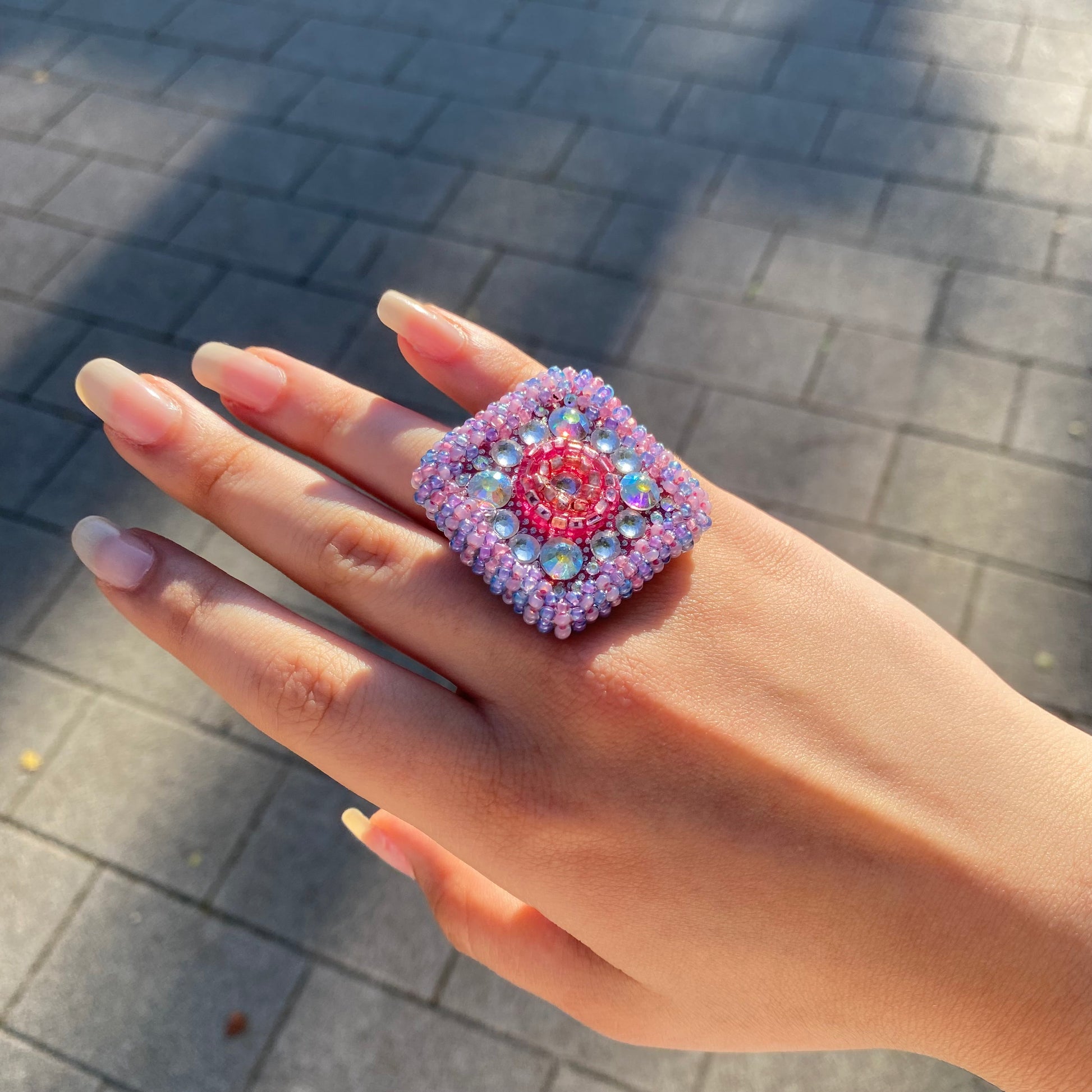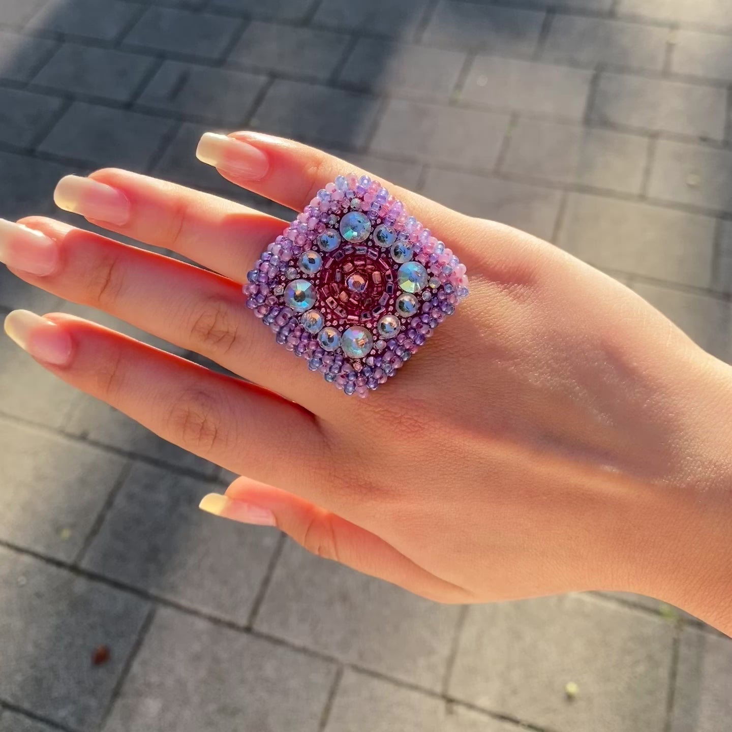 A true statement piece, this square-shaped handmade ring stands out with its bold geometric design. Crafted with purple seed beads, textile elements, metal, and Swarovski crystals, it creates a stunning mix of sparkle and color.